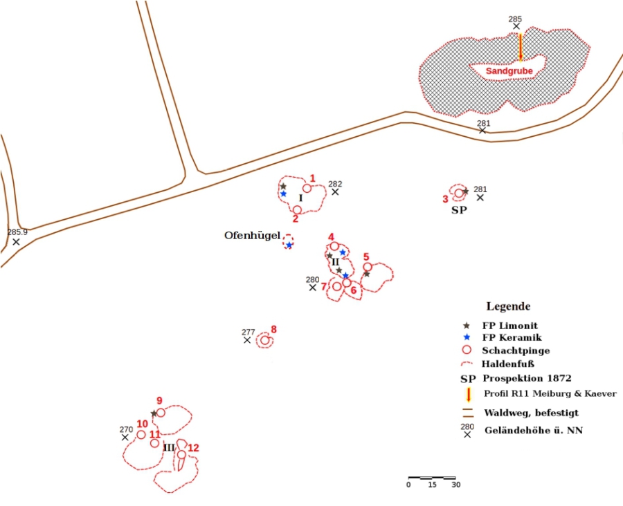 Erste Kenntnis eines möglichen Pingenfeldes erlangte der Autor durch den Geologie Viewer Hessen mit der Hintergrundkarte „Schummerung“, wo die Pingen und die umgebenden Halden klar zu erkennen sind. Bei einer ersten Begehung am 16. 04. 2020 wurde vor Ort etwa 25 m südlich von einem befestigten Waldweg eine Halde (Nr. I in Abb. 2) mit zwei Pingen, eine im Norden und eine im Süden in 15 m Entfernung voneinander, mit einer annähernd ovalen 35 x 19 m großen und etwa 0,5 – 1 m hohen Halde dazwischen erkannt. Von einer frei erodierten Fläche wurden einige kleine ockerfarbene Sandsteinsstücke aufgelesen. Eines der Stücke wurde später mittels eines Gasbrenners rotglühend erhitzt und zeigte danach eine magnetische Eigenschaft. Es enthält wohl Goethit1 (α-Fe3+O[OH]), dass normalerweise antiferromagnetisch ist, sich aber vor dem Lötrohr in Eisen(III)-oxid (α-Fe2O3) wandelt und magnetisch wird.